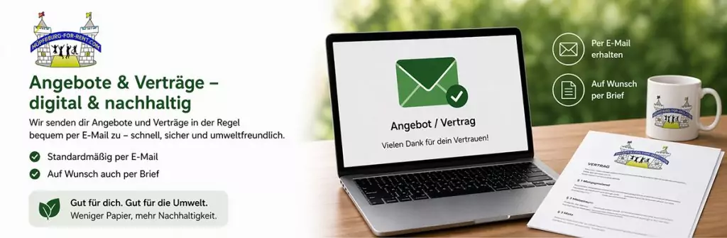 Angebote und Verträge versenden wir in der Regel per E-Mail. Viele Unterlagen können direkt digital in der PDF-Datei unterschrieben und papierlos zurückgesendet werden. Auf besonderen Wunsch ist natürlich auch der Versand per Post möglich.