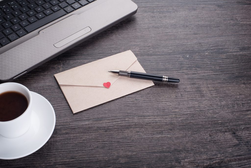 Banner promoting digital and sustainable offers and contracts with a laptop displaying an envelope icon and a printed contract on a desk, plus a mug and bullets on the left.